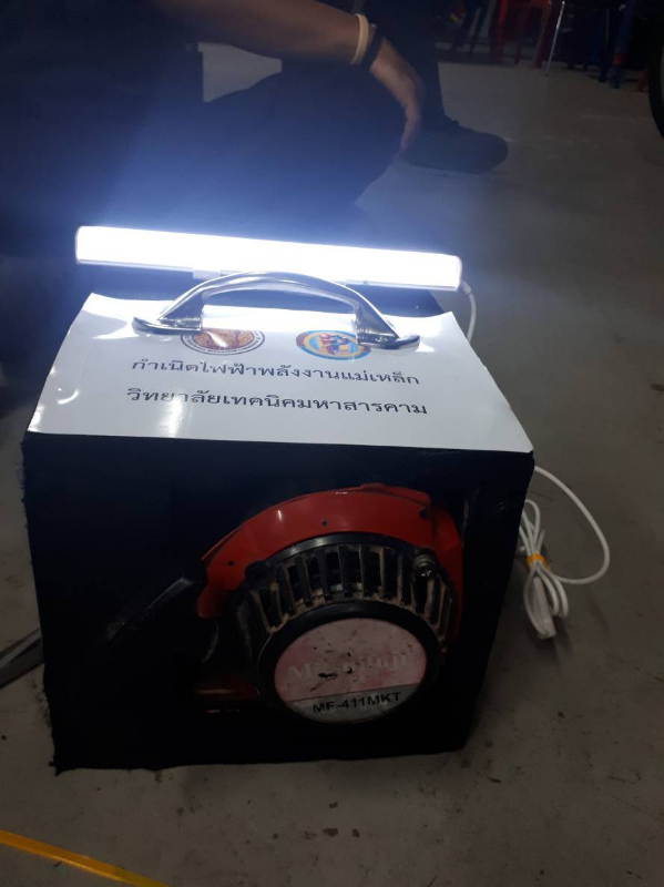 เครื่องกำเนิดฟ้าพลังงานแม่เหล็ก คือ เครื่องกำเนิดไฟฟ้าโดยอาศัยการดูดและผลักดันของแม่เหล็กระหว่างขั้ว s และn ในการหมุนเริ่มต้นอาศัยการดึงของชุดสตาร์ทเครื่องตัดหญ้าเมื่อเกิดการหมุนก็จะอาศัยแรงเหวี่ยงของล้อแม่เหล็กเป็นให้เกิดการหมุนง่ายและหยุดช้าขึ้น เมื่อแกนเจนเนอเรเตอร์หมุนก็จะผลิตไฟออกมาใช้งานและมีชุด เล็กคูเรเตอร์ชาร์จไฟอีกตัวหนึ่ง เพื่อช่วยให้มอเตอร์เจนเนอเรเตอร์หมุนถ้าเกิด ไฟฟ้าที่ออกมาใช้งานอาจออกมาน้อยก็จะมีชุด บูสต์คอนเวอร์เตอร์ เพื่อเพิ่มแรงดันไฟเพื่อ ออกไปใช้งาน ในการแสงสวางและชาร์จโทรศัพย์เป็นต้น