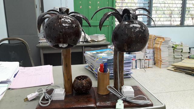 สรุปแนวคิดและความเป็นมาของการประดิษฐ์ผลงาน มาจากปัญหาอะไรจึงการประดิษฐ์ผลงานมาแก้ปัญหา(ไม่ควรเกิน 6 บรรทัด) โคมไฟจากกะลามะพร้าวไล่ยุง เป็นการสร้างสิ่งประดิษฐ์ที่มีอยู่จากเศษวัสดุเหลือใช้และจากวัสดุธรรมชาติ โดยทำมาจากกะลามะพร้าว เนื่องจากทางคณะผู้จัดทำ ต้องการให้ภายนอกมีความอ่อนโยนดูสวยงามจึงใช้แชลคเคลือบ ทั้งนี้ได้มีการใช้หลอดไฟที่สามารถไล่ยุงได้มาประกอบให้เป็นโคมไฟจากกะลามะพร้าวให้สมบูรณ์ และเกิดประโยชน์สูงสุดในราคาในประหยัดสามารถหาอุปกรณ์ตามทิ้งถิ่นได้